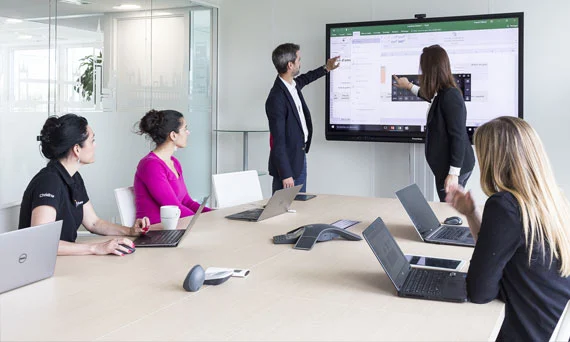 Work with web, video and telepresence solutions on one collaborative interactive display. Wirelessly share screens from mobile devices, setup web conferences, interact with documents, spreadsheets, software, and instantly record trainings to save and distribute information to all team members efficiently.